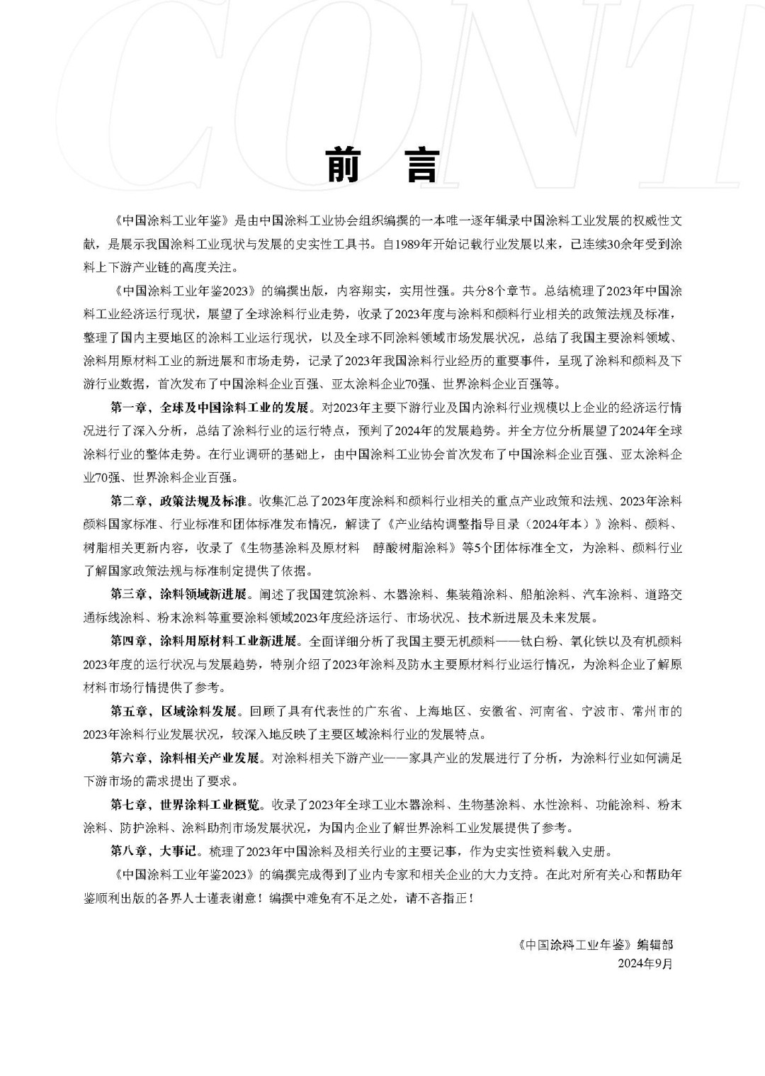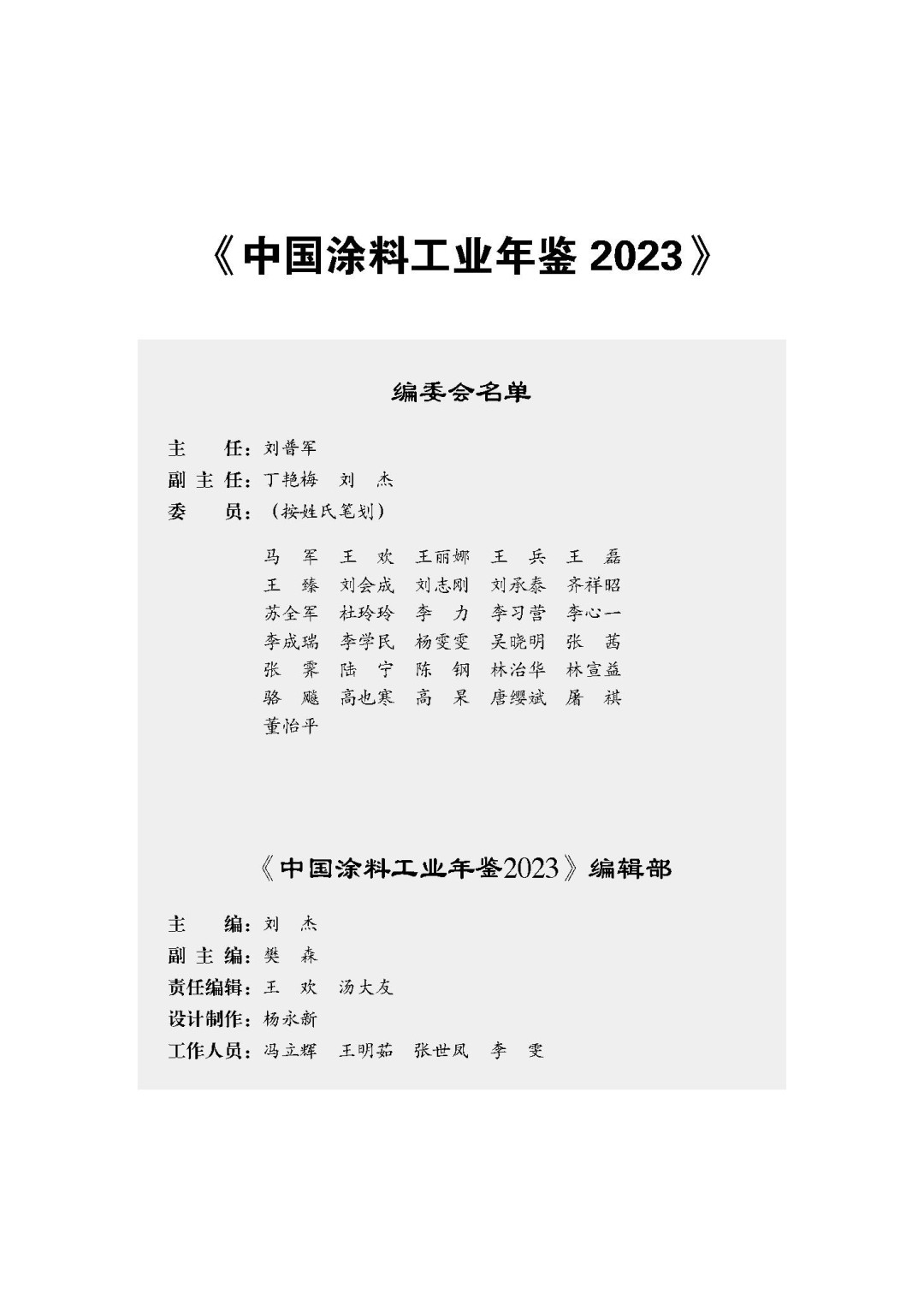 《中國涂料工業(yè)年鑒2023》的編撰完成得到了業(yè)內(nèi)專家和相關(guān)企業(yè)的大力支持。在此對所有關(guān)心和幫助年鑒順利出版的各界人士謹(jǐn)表謝意!編撰中難免有不足之處,請不吝指正!