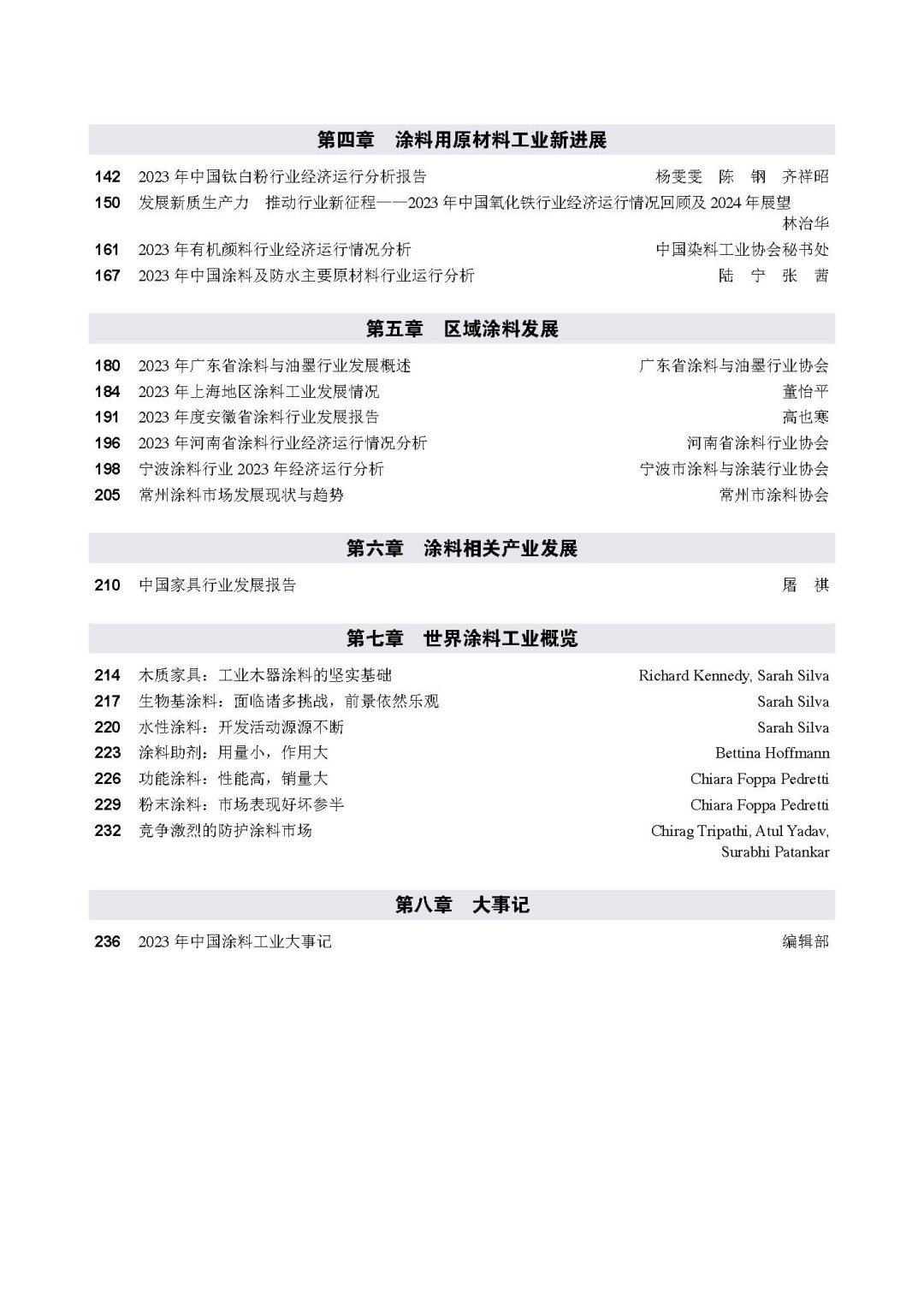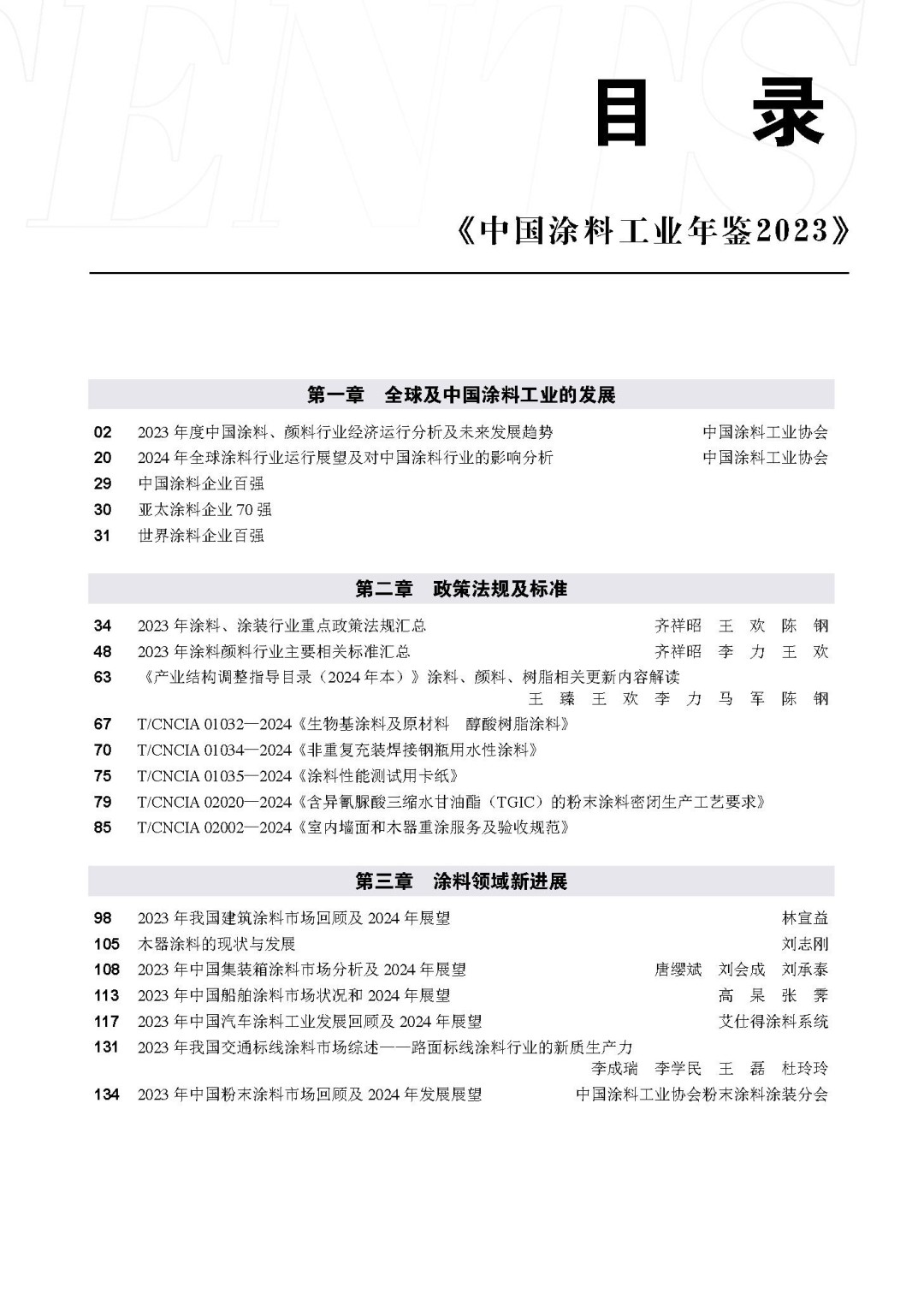 第八章,大事記。梳理了2023年中國涂料及相關(guān)行業(yè)的主要記事,作為史實性資料載入史冊。