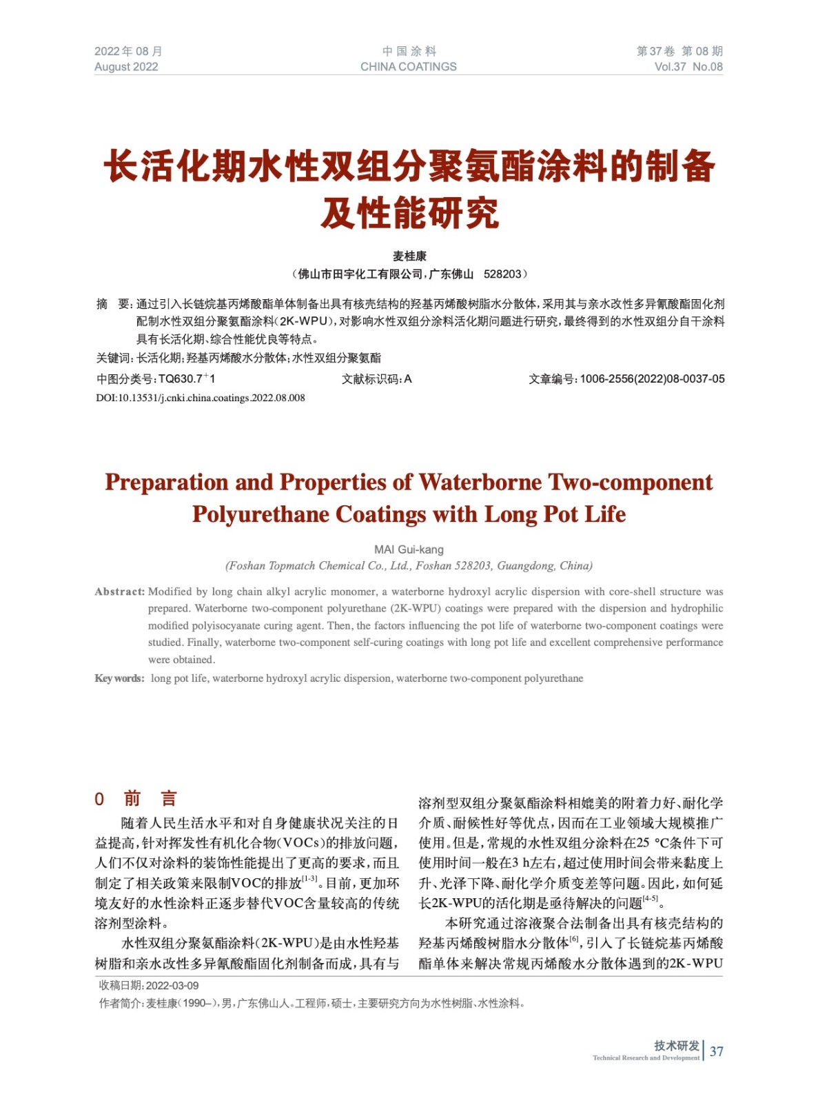 通過引入長鏈烷基丙烯酸酯單體制備出具有核殼結構的羥基丙烯酸樹脂水分散體,采用其與親水改性多異氰酸酯固化劑配制水性雙組分聚氨酯涂料(2K-WPU),對影響水性雙組分涂料活化期問題進行研究,最終得到的水性雙組分自干涂料具有長活化期、綜合性能優良等特點。