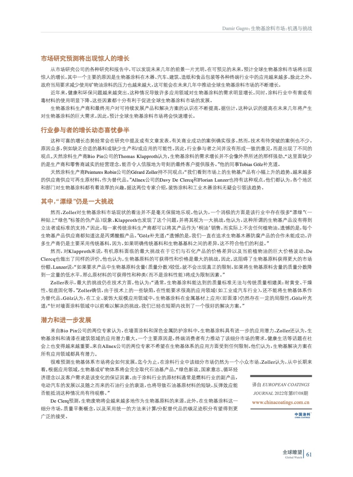編者按:在整個涂料行業中,生物基體系仍然是一個小眾市場。然而,事實證明,該小眾市場非常強勁,呈現出很多增長機遇?,F在,可持續發展和環保解決方案已經成為社會大眾的話題,而不僅僅是邊緣群體的一種趨勢。近年來,涂料生產商不斷努力擴大生物基涂料的范圍,甚至將其納入到產品系列中。