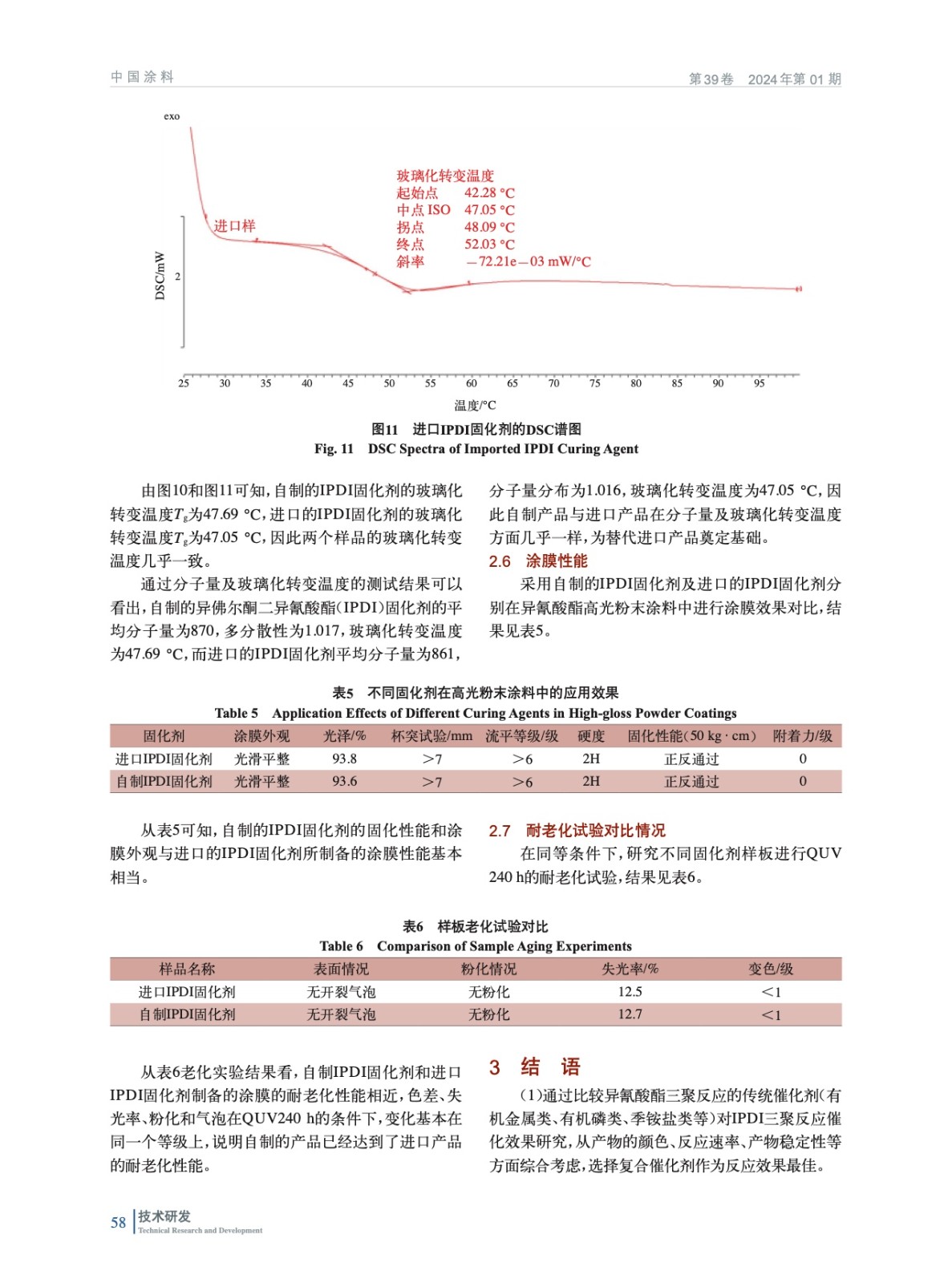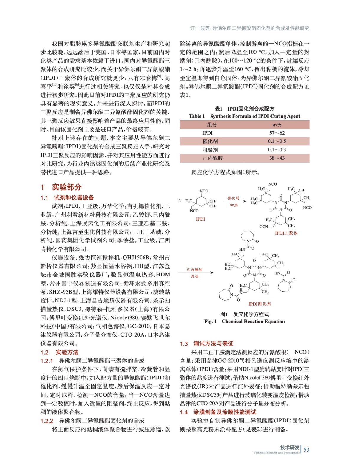 采用異佛爾酮二異氰酸酯(IPDI)為原料合成了一款聚氨酯固化劑,且研究了反應進程的影響因素(如催化劑的類別及使用量、反應時間和反應溫度等),產品通過FT-IR、GPC和DSC進行結構表征及涂膜應用性能評價,效果較好。