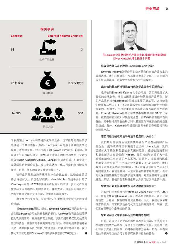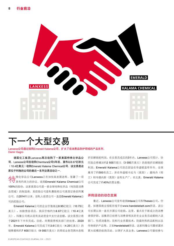 Lanxess公司通過收購Emerald Kalama公司,擴大了在消費品防護領域的產品系列