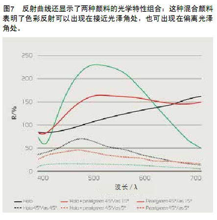 > 從上述多色彩顏料的噴漆圖可看出,在觀察角的任意一側都可檢測到兩道彩虹帶之間出現一個間隙。可加入干涉顏料填補這個間隙。此類混合物可用多種方式制成,干涉顏料的選定顏色也可能影響彩虹色(見圖5、圖6和圖7)。