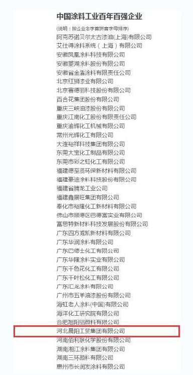 10月10日,由中國涂料工業(yè)協(xié)會(huì)主辦的中國涂料工業(yè)百年百強(qiáng)評(píng)選活動(dòng)結(jié)果公布,晨陽水漆當(dāng)選“中國涂料工業(yè)百年百強(qiáng)企業(yè)”榮譽(yù)稱號(hào)。