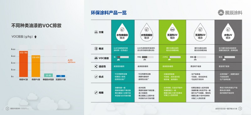 縱觀現在業內的方案,要么偏向水性,要么局限于UV,然而家具廠商面臨的實際情況并不僅僅是水性或者UV一種就能獨立解決的;展辰的“一攬子”恰恰就解決了這些方案片面的問題,也是目前業內唯一能綜合解決這種問題的供應商,而由“水性噴涂,UV輥涂,UV噴涂,水性UV噴涂”四大核心衍伸出來的一整套涂裝體系,正是經過實踐檢驗的結果。