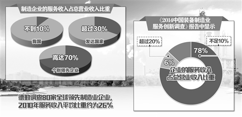 其中,有一個對企業(yè)服務型制造發(fā)展的量化指標,即示范企業(yè)服務收入占銷售收入的比重達到30%左右。對此,工信部產(chǎn)業(yè)政策司相關負責人解釋說,按照中國機械工業(yè)聯(lián)合會與德勤聯(lián)合發(fā)布的《2014中國裝備制造業(yè)服務創(chuàng)新調(diào)查》報告顯示,78%調(diào)查企業(yè)的服務收入占總營業(yè)收入比重不足10%,只有6%的調(diào)查企業(yè)占比超過20%。德勤調(diào)查了80家全球領先制造業(yè)企業(yè),2010年服務收入平均比重約為26%。綜合相關調(diào)研成果,《行動指南》把示范企業(yè)服務收入占比設定在30%左右是完全可行的,也充分體現(xiàn)了發(fā)展的趨勢和要求。