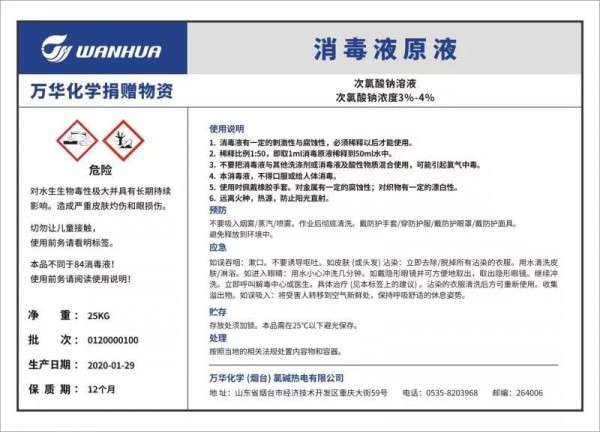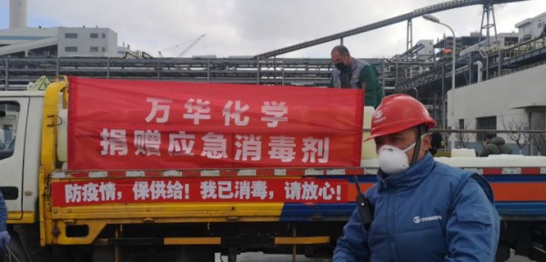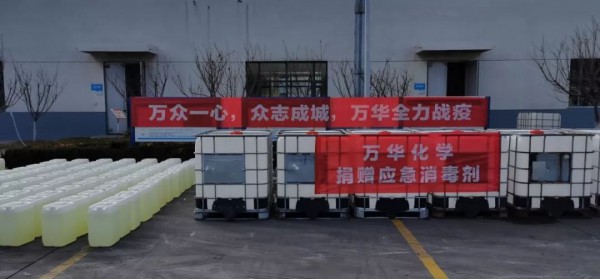 3)面對疫情蔓延消殺用品供應不足狀況,向煙臺市政府防疫工作小組承諾:萬華化學申請成為煙臺市消毒液的后備儲備單位,疫情期間根據政府要求向煙臺市免費敞口供應消毒液,全力支持疫情防控。首批捐贈消毒液10000公斤,已陸續送往煙臺市開發區應急管理局和煙臺市應急管理局。