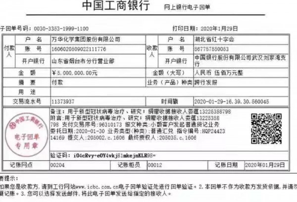 1)向湖北紅十字會捐款現金500萬元人民幣,用于新型冠狀病毒治療研究,醫療、防護設施購置,保障醫護人員安全和病人救治。