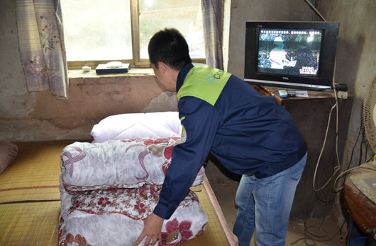 工作人員為幫扶戶更換新購(gòu)置被褥