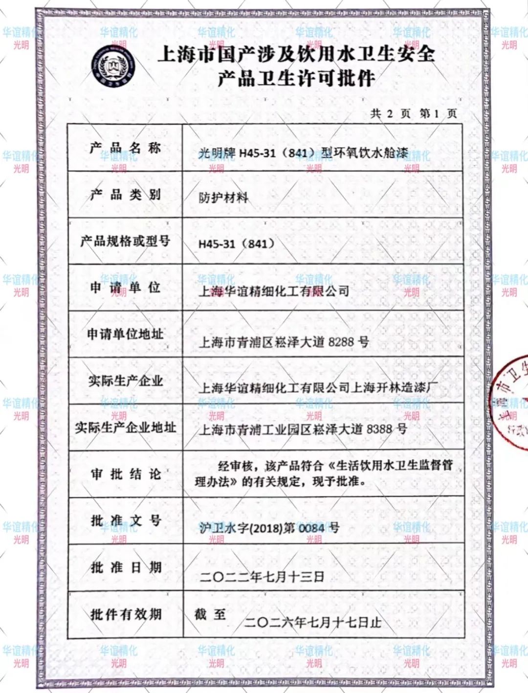 開林廠是老牌生產船舶涂料的企業,其中H45-31(841)產品主要應用于船舶飲水艙、蒸餾水艙、水箱、輸水管道等各類涉水容器內壁,因涉及飲用水安全,作為產品生產企業,開林秉著對社會負責、對客戶負責、對自己負責的企業精神,把保障產品安全的生產理念放在首位。早在2003年就取得涉水產品衛生許可批件證書,這一證書是H45-31(841)產品是否符合飲用水衛生安全要求最為重要的標準之一,也是進入涉及飲用水產品市場的“準入證”,更是確保涉水產品衛生安全、產品質量的必要措施。