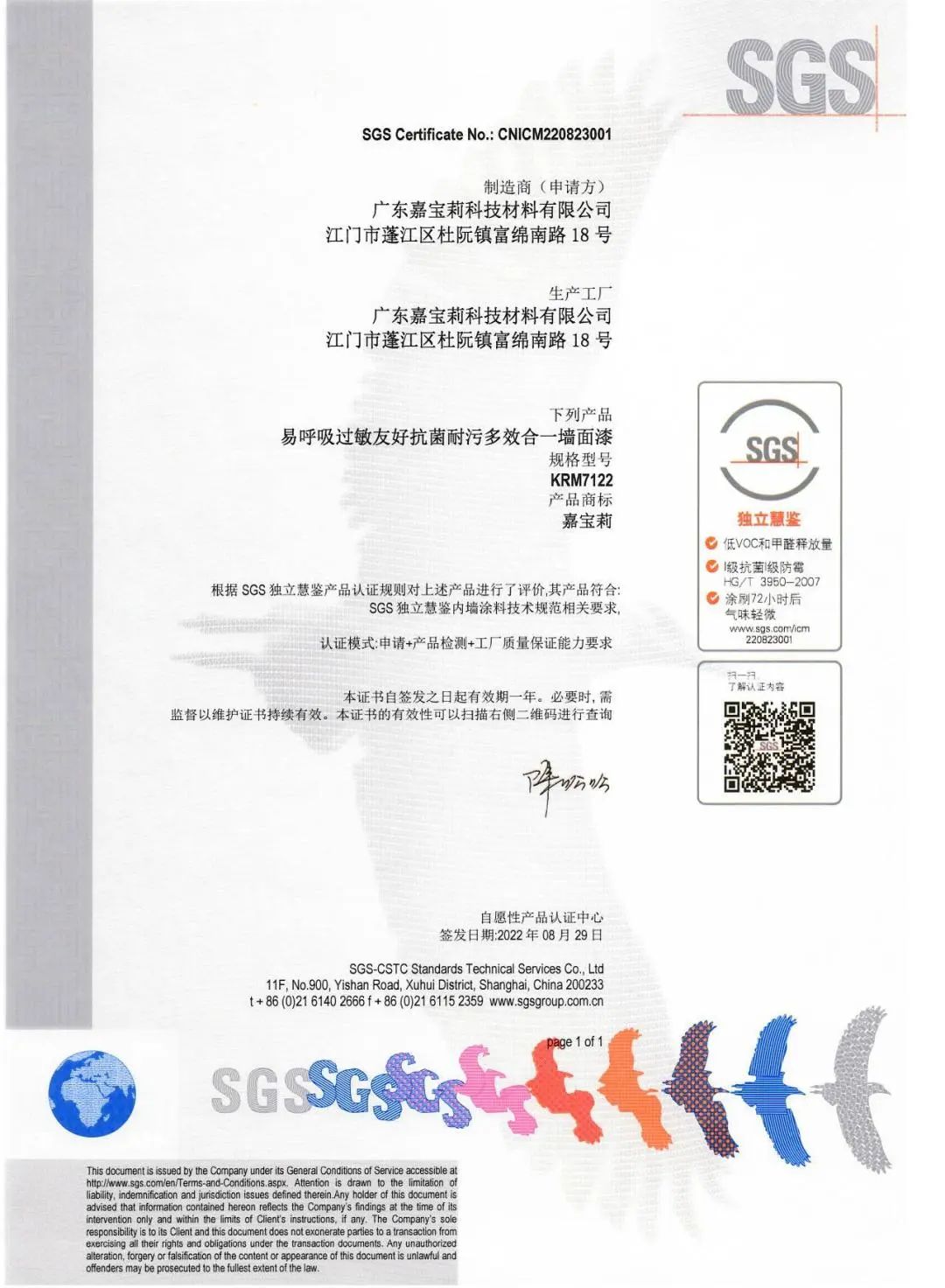 易呼吸墻面漆獲頒國內(nèi)第一張涂料行業(yè)獨立慧鑒認證,是嘉寶莉長期以來堅持綠色發(fā)展、引領(lǐng)品質(zhì)、健康、環(huán)保,創(chuàng)造美好生活的重要體現(xiàn)。而此次SGS獨立慧鑒認證的頒發(fā),則是對嘉寶莉易呼吸墻面漆強大產(chǎn)品實力的又一次佐證。嘉寶莉堅信,只有專注研發(fā)創(chuàng)新,追求卓越品質(zhì),才能真正實現(xiàn)用涂料裝飾和保護我們熱愛的世界。