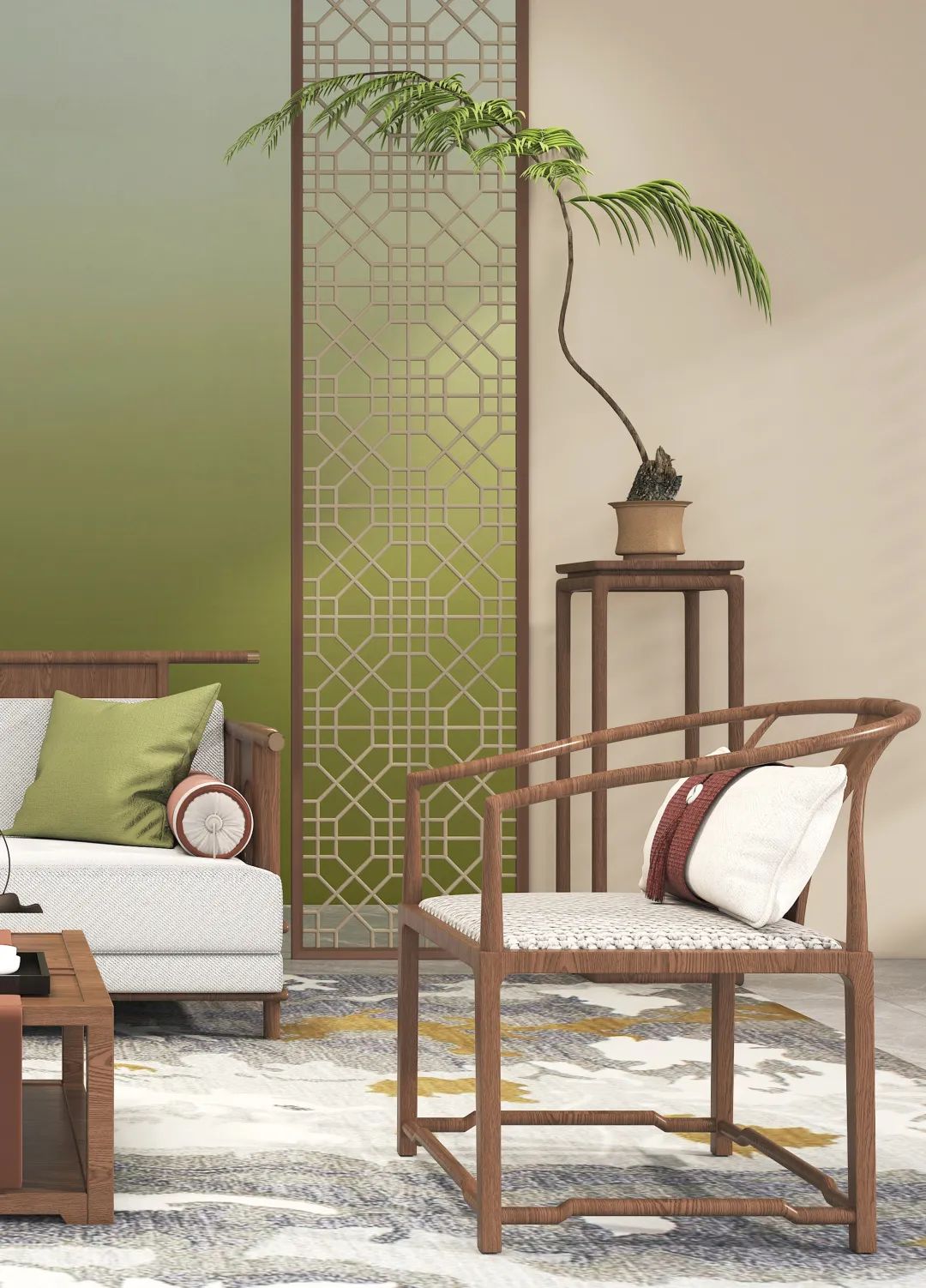 春辰綠與深棕色、米白色的組合,呈現(xiàn)靈動質(zhì)樸的東方美學(xué)意境。簡約純粹的色彩,與中式家具的流暢線條相呼應(yīng),虛實之間盡顯詩意的文雅情趣。