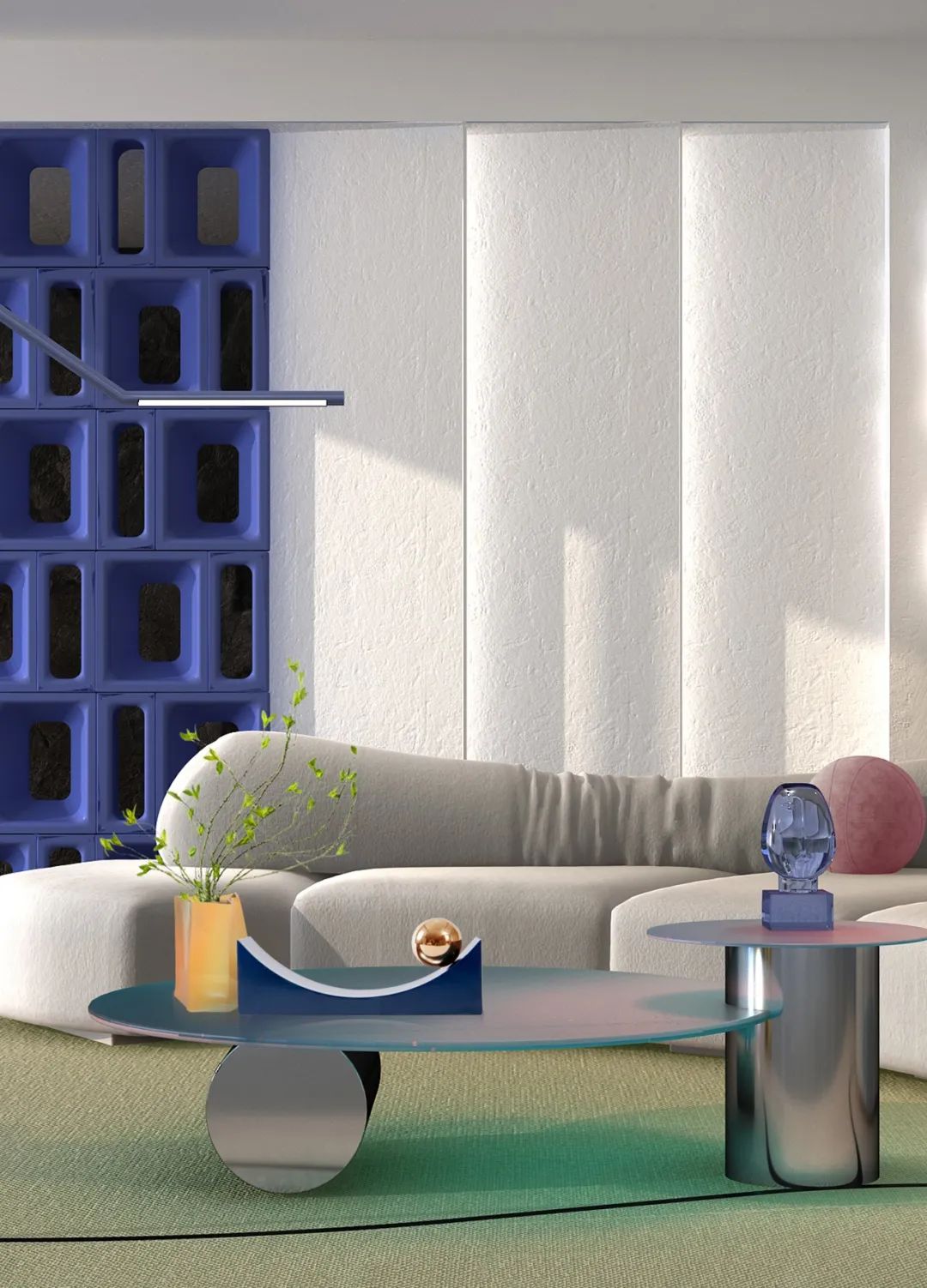 春辰綠搭配科技感的藍(lán)色與中性白色,形成和諧的冷色調(diào)組合;跳躍的明黃色與柔和的灰粉色作為小面積點綴,共同形成色彩間的視覺對比,打造充滿未來感,又不失前衛(wèi)時尚的現(xiàn)代風(fēng)格居室。