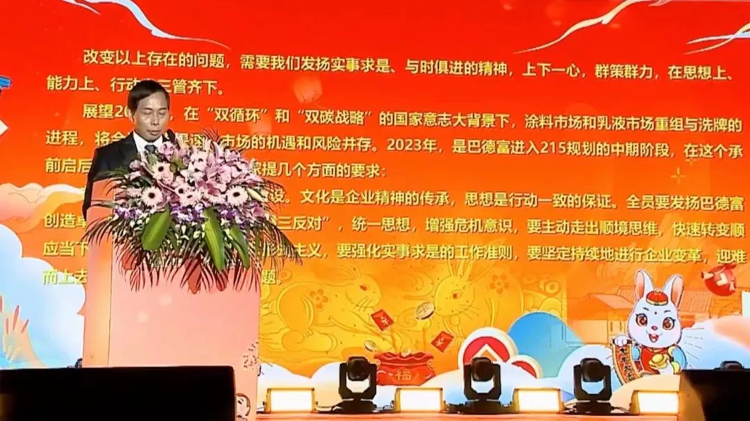 集團董事長梁千盛致新春賀詞,梁董總結了公司2022年的工作情況,提出要實事求是、上下一心,從“思想、行動、能力”三管齊下謀發展,從加強思想和文化傳承、加快關鍵能力建設、行動提速等方面提出工作要求。梁董勉勵全體巴德富人,要主動擁抱變化,無畏挑戰,牢記初心,繼續發揚艱苦奮斗的創業精神。