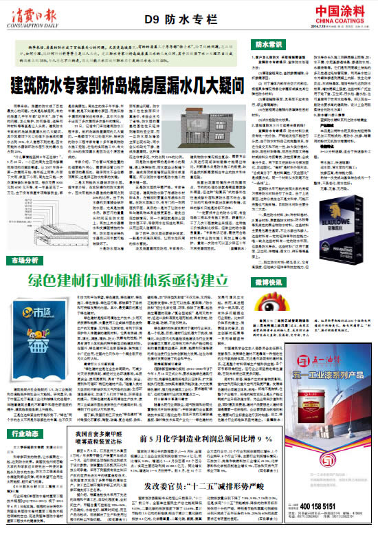 《中國涂料報》(電子版)的一切內容(包括但不限于文字、圖片、PDF、圖表、標志、標識、商標、版面設計、專欄目錄與名稱、內容分類標準以及為讀者提供的任何信息)僅供中國涂料信息網讀者閱讀、學習研究使用,未經中國涂料雜志社有限公司及/或相關權利人書面授權,任何單位及個人不得將《中國涂料報》(電子版)所登載、發布的內容用于商業性目的,包括但不限于轉載、復制、發行、制作光盤、數據庫、觸摸展示等行為方式,或將之在非本站所屬的服務器上作鏡像。否則,中國涂料雜志社有限公司將采取包括但不限于網上公示、向有關部門舉報、訴訟等一切合法手段,追究侵權者的法律責任。